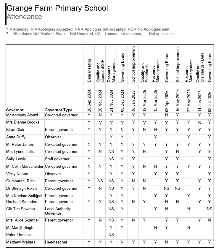 Governor attendance at meetings from the last academic year can be seen at the bottom of this page, as can the roles held by current members.